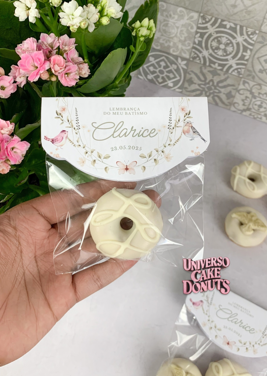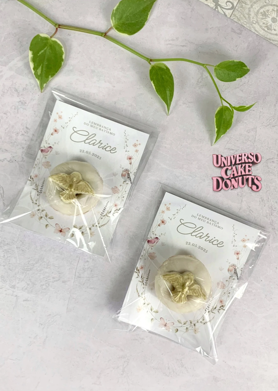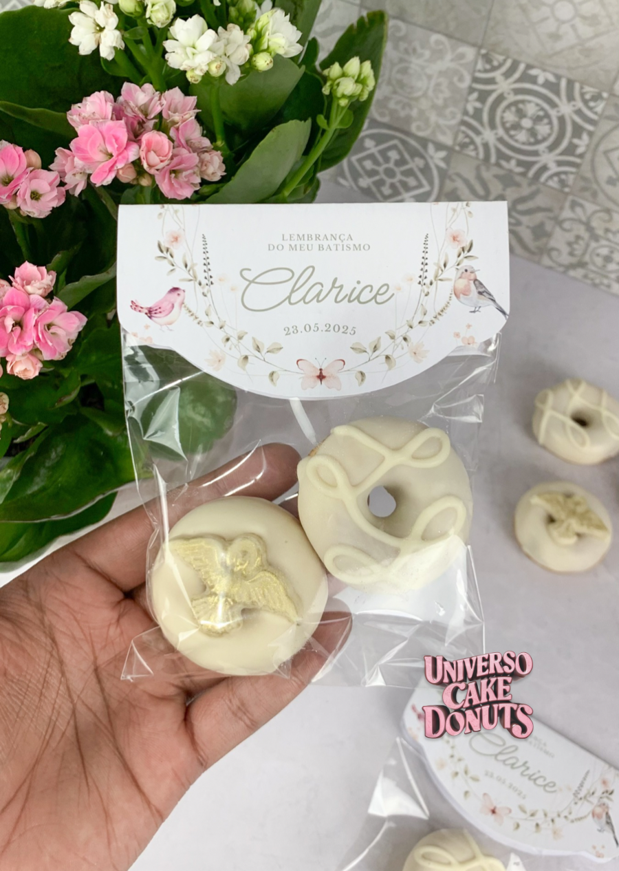 Transforme seus mini cake donuts em lindas lembrancinhas de batizado com o nosso kit de arquivos! Criadas para imprimir em papel A4 e fáceis de montar sem máquina de corte, essas embalagens oferecem praticidade e um toque especial para suas encomendas de lembrancinhas.