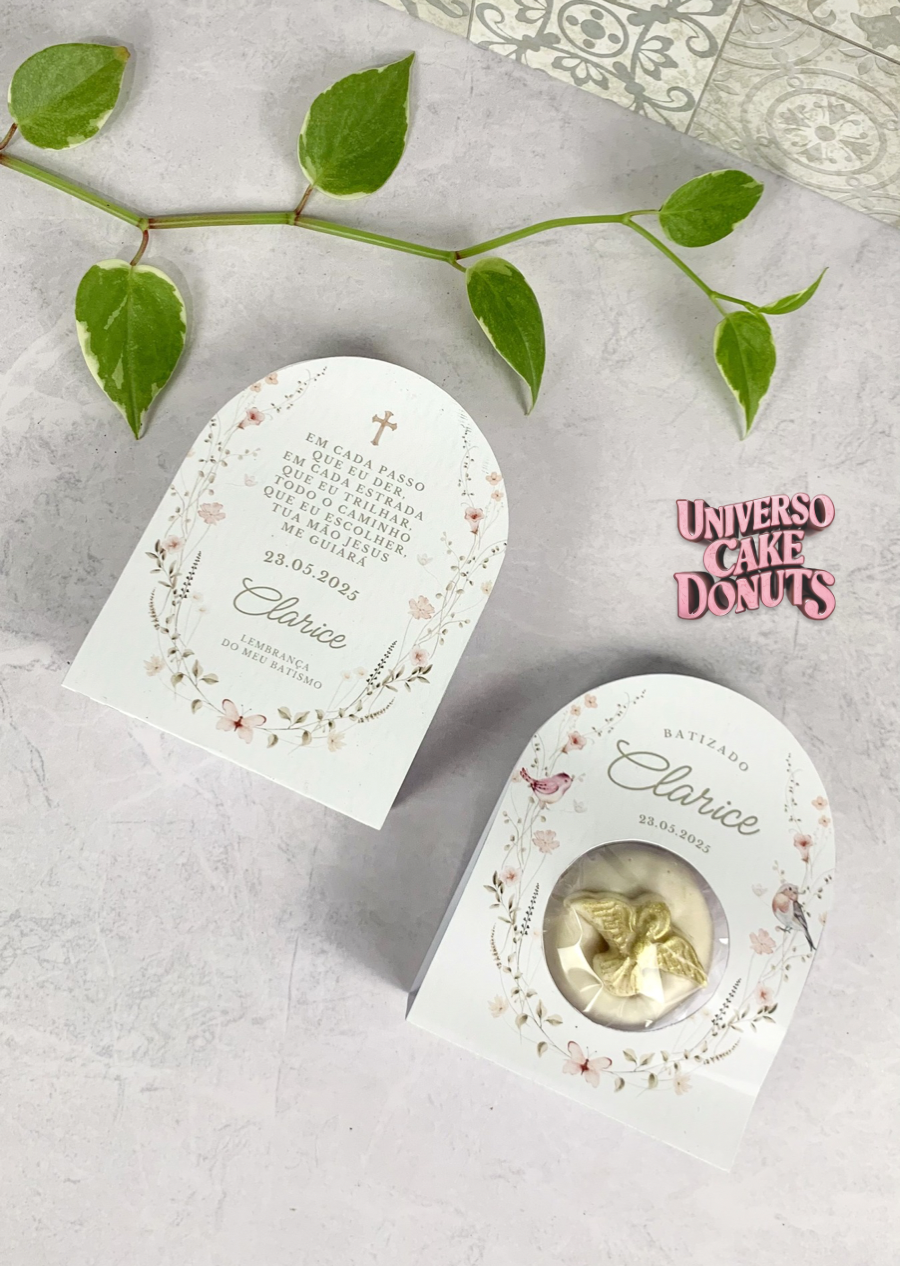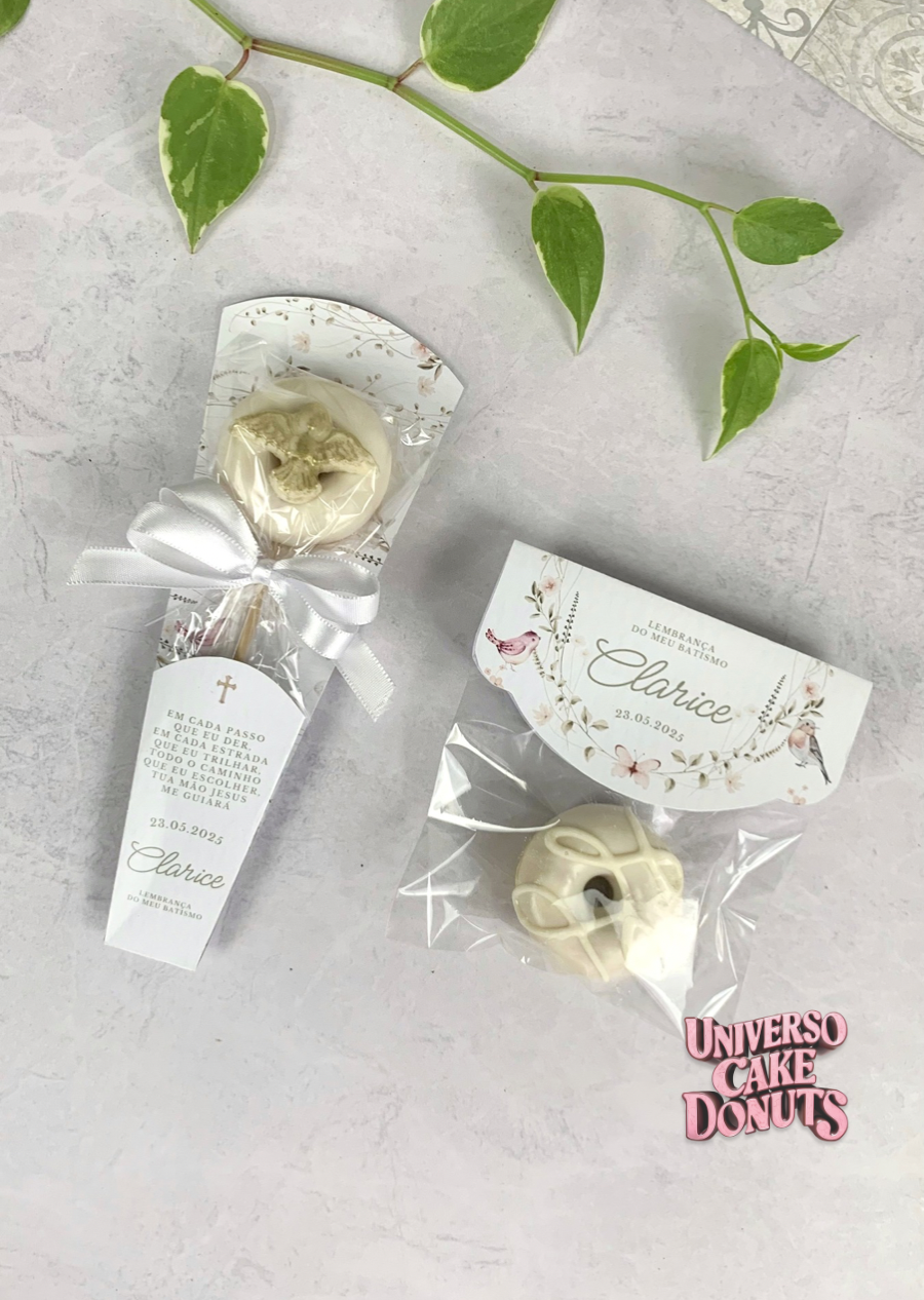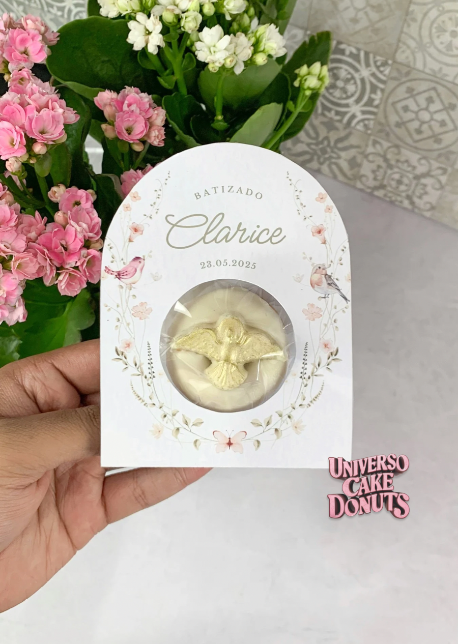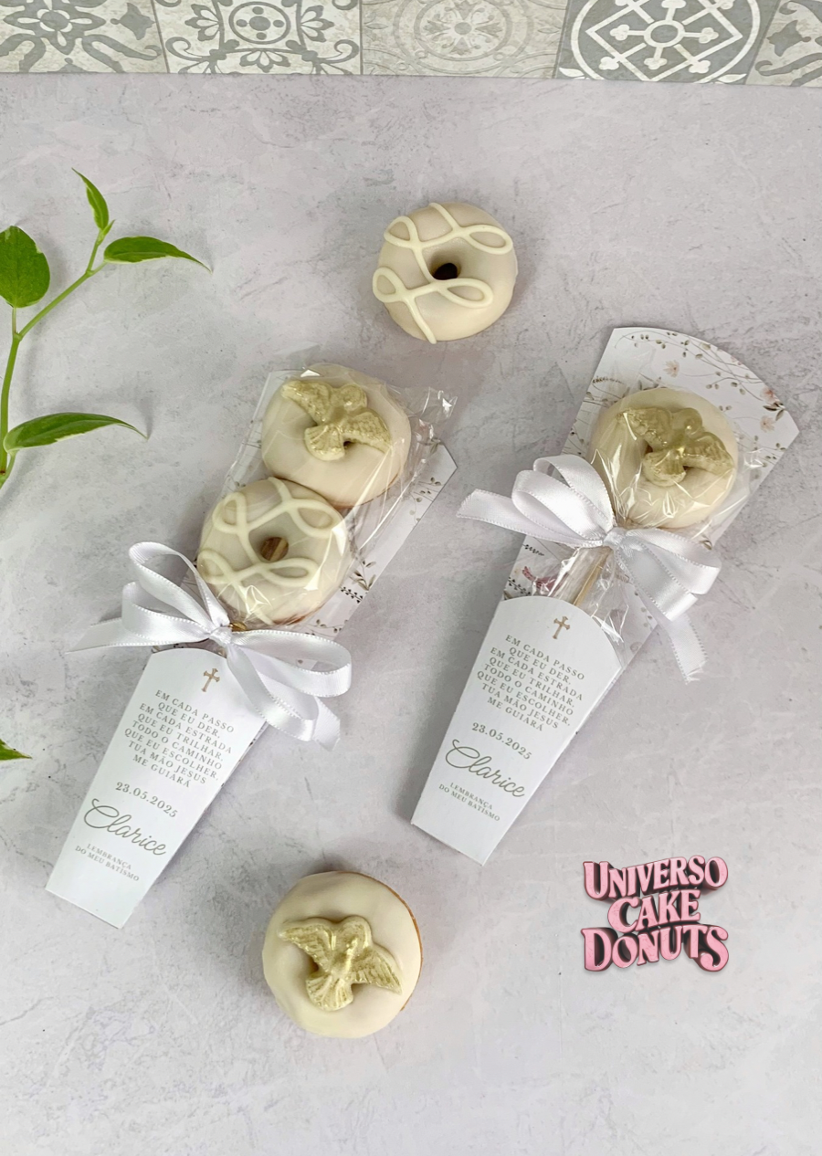 Transforme seus mini cake donuts em lindas lembrancinhas de batizado com o nosso kit de arquivos! Criadas para imprimir em papel A4 e fáceis de montar sem máquina de corte, essas embalagens oferecem praticidade e um toque especial para suas encomendas de lembrancinhas.